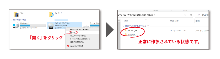 制作いただいた映像はMP4やMOVなどの動画データファイルのままでは会場で再生することができません。DVD書き込みソフト(オーサリングソフト)を使用し、動画データファイルをDVD-VIDEO形式にてDVD-Rに書き込みをしてください。また、上記方法で正常に書き込みを行うと、DVD-R内に上記のようなファイルが生成・表示されます。