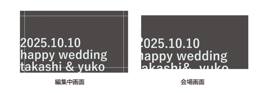 会場のスクリーンに投影される映像の表示範囲は、PCでの再生時よりも小さくなることがあります。外側に余裕をも持って文字を配置していただくと、文字を全て表示することができます。