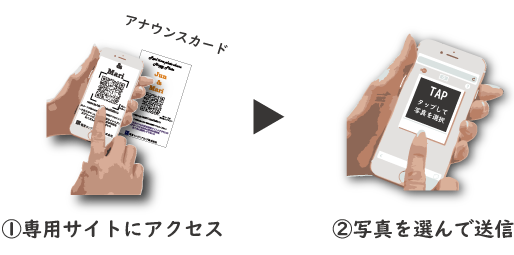 当日の受付のタイミングや、ご披露宴宴会場のお席に、QRコードが印刷されたアナウンスカードをご用意いたします。また、事前にアナウンスカードをお渡しすることもできるので、当日のゲストのみならず、どなた様でも、どこからでも、リアルタイムでご参加いただけます。また、期間内であれば、何度でもご利用いただけ、画像のダウンロードも可能です。
