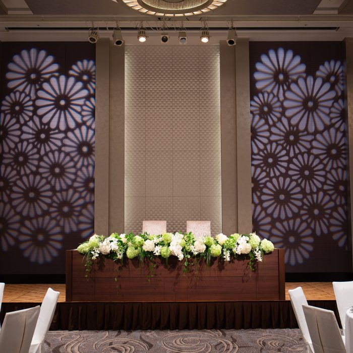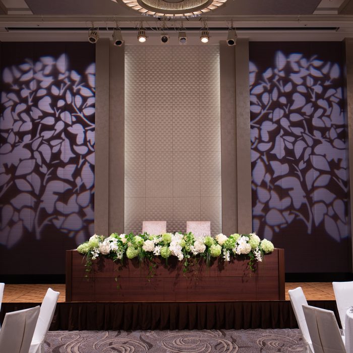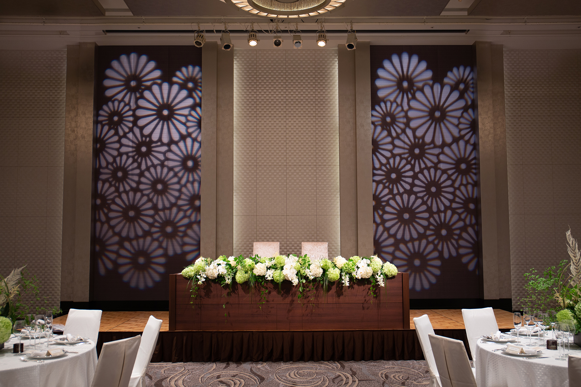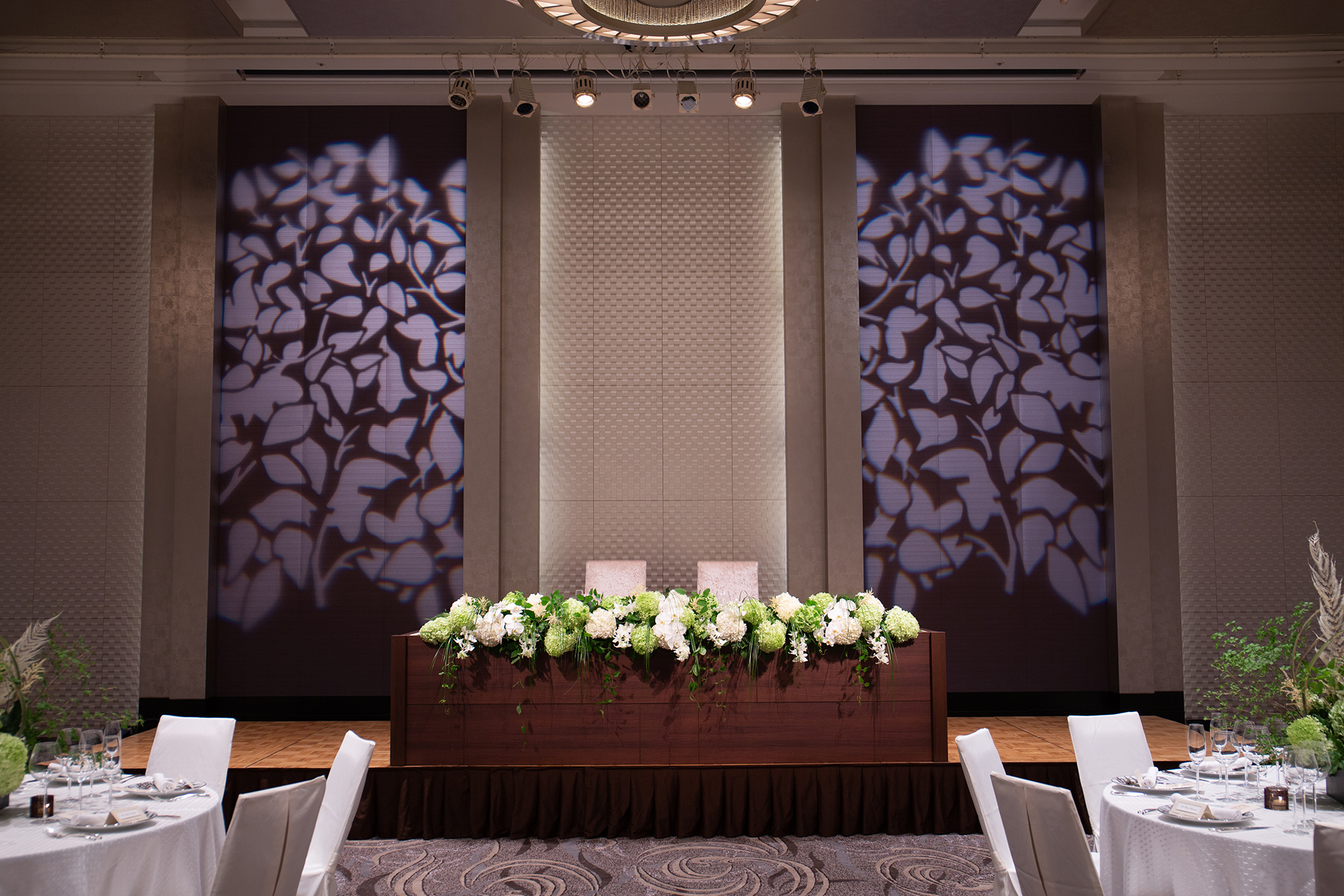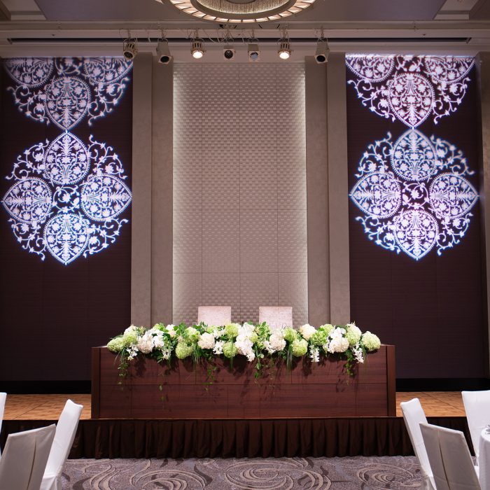 メインテーブル後方に光で描く模様を加えることで より一層会場を引き立たせます