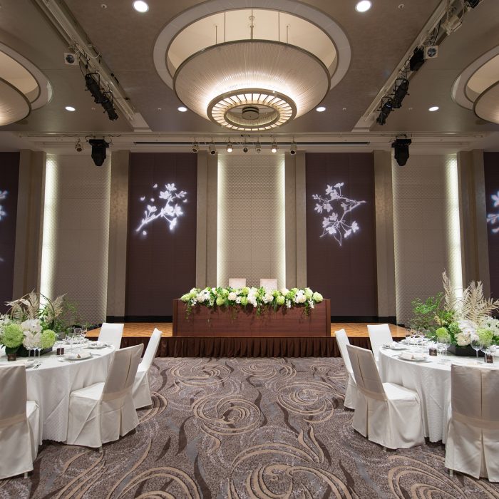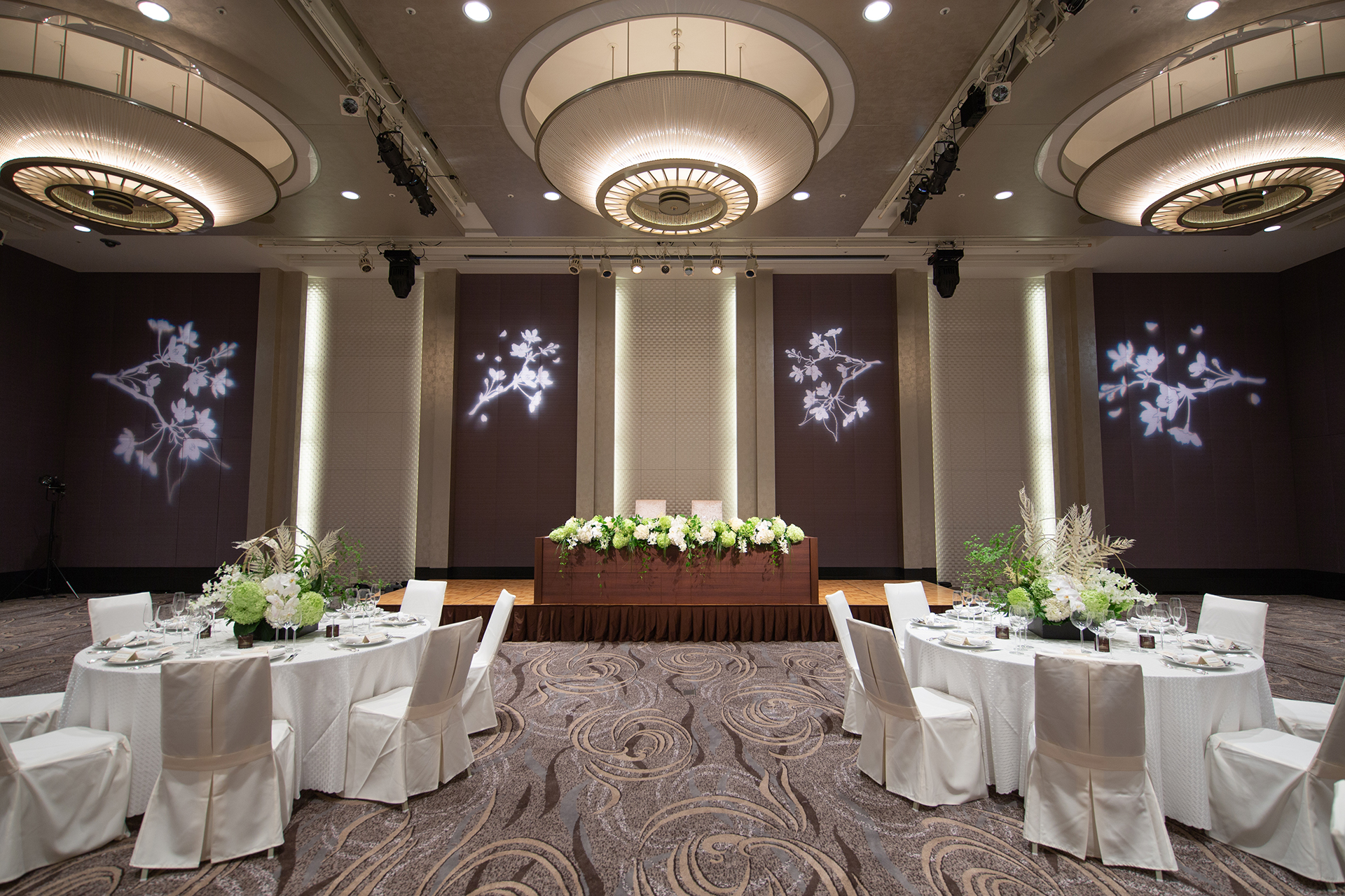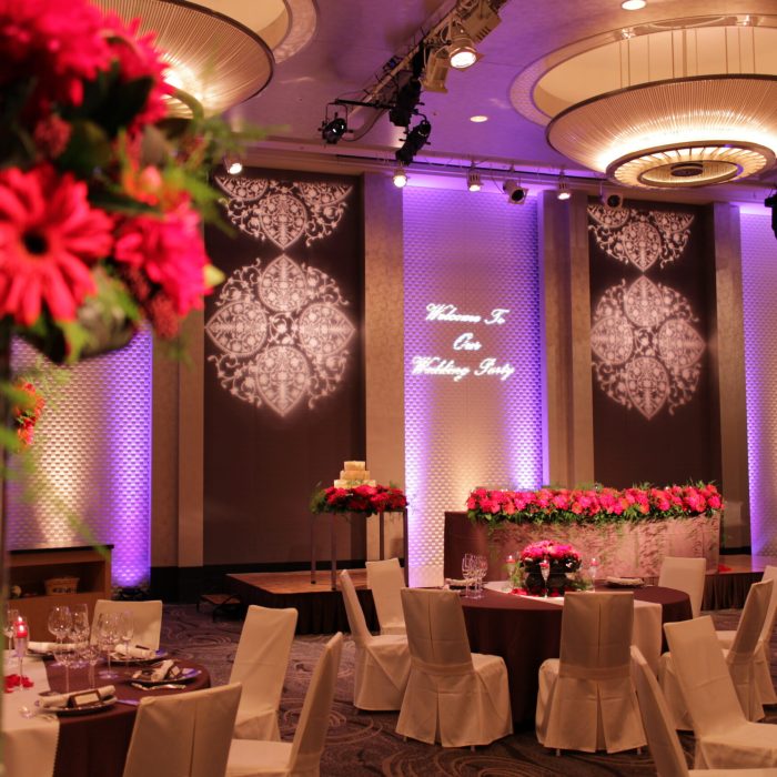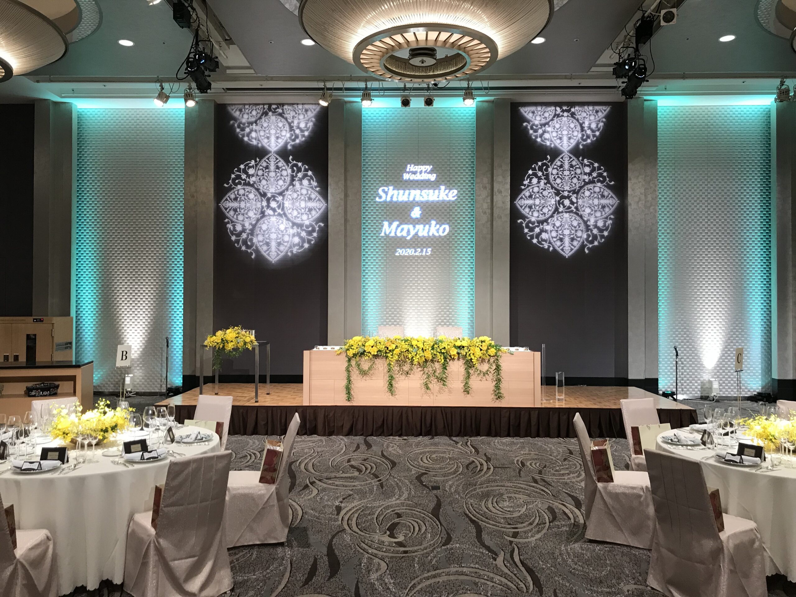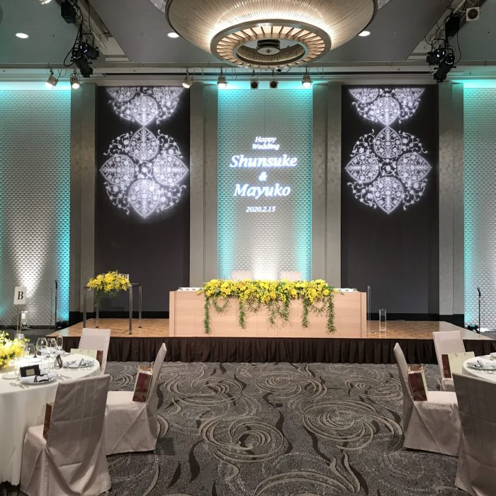 メインテーブル後方に光で描く模様を加えることで より一層会場を引き立たせます