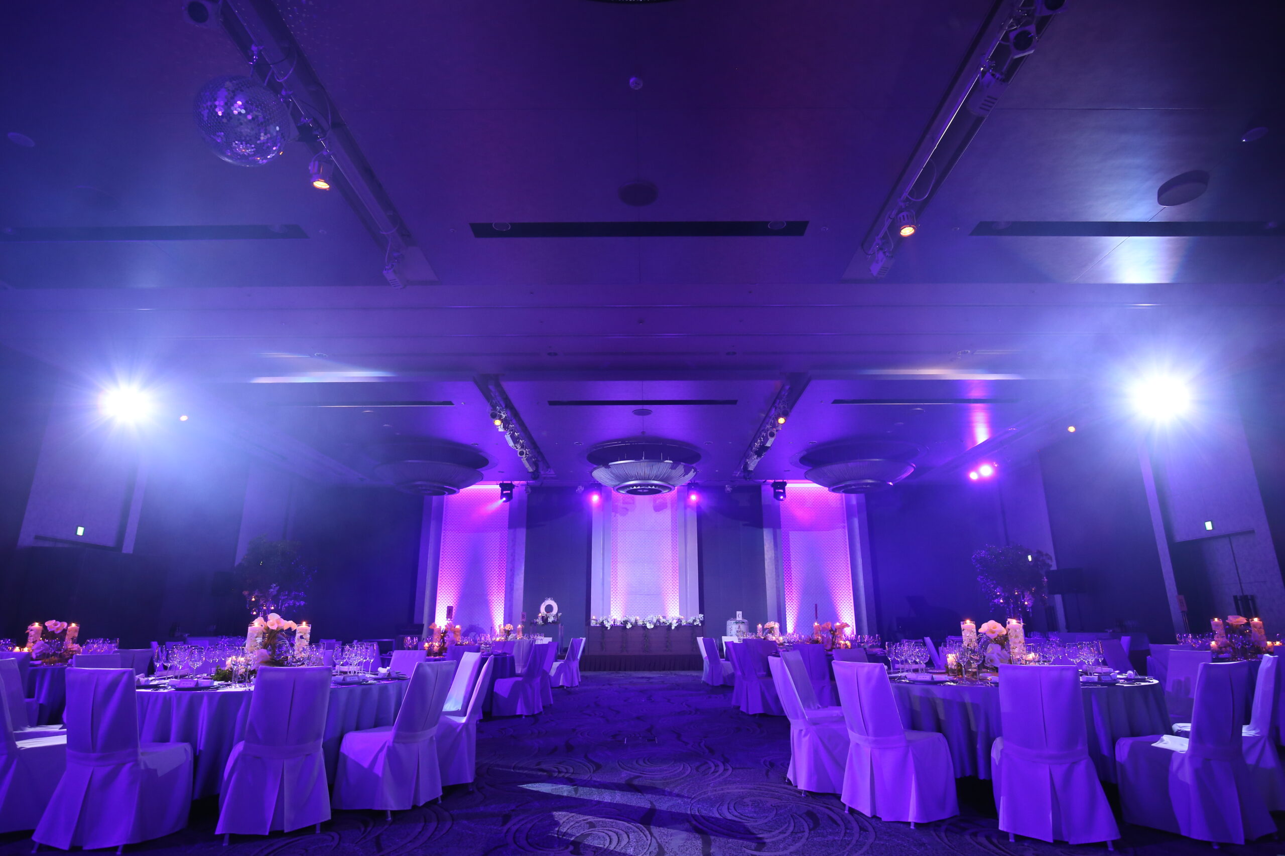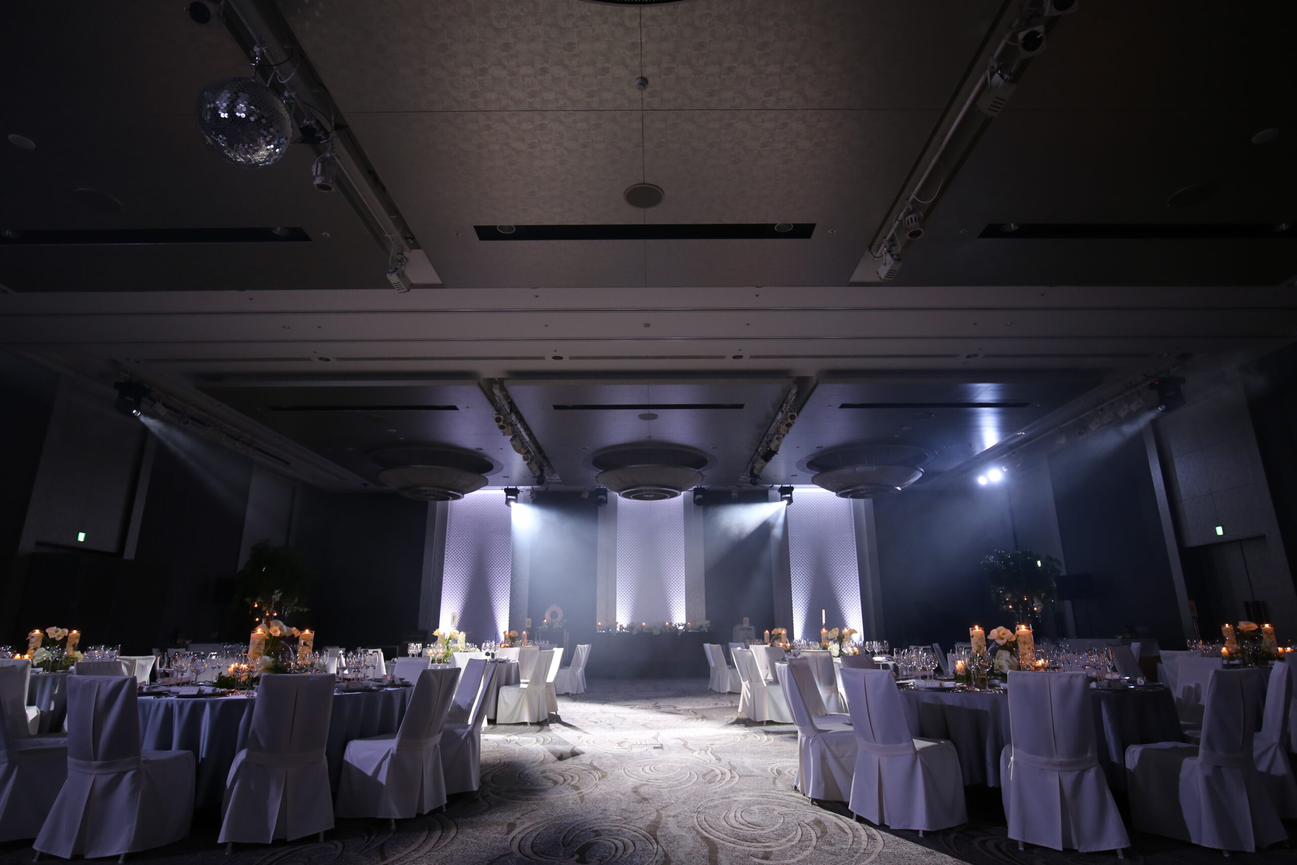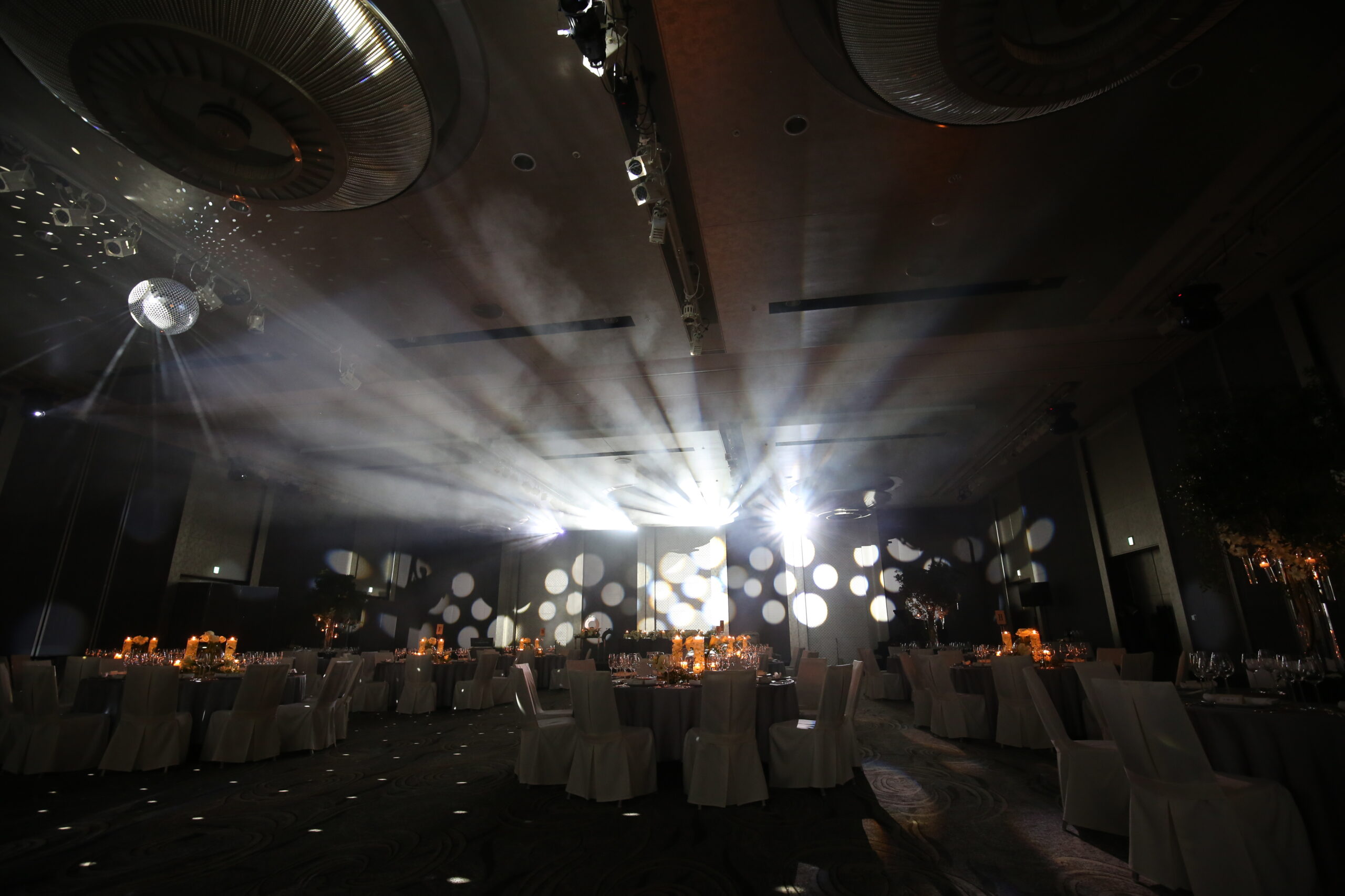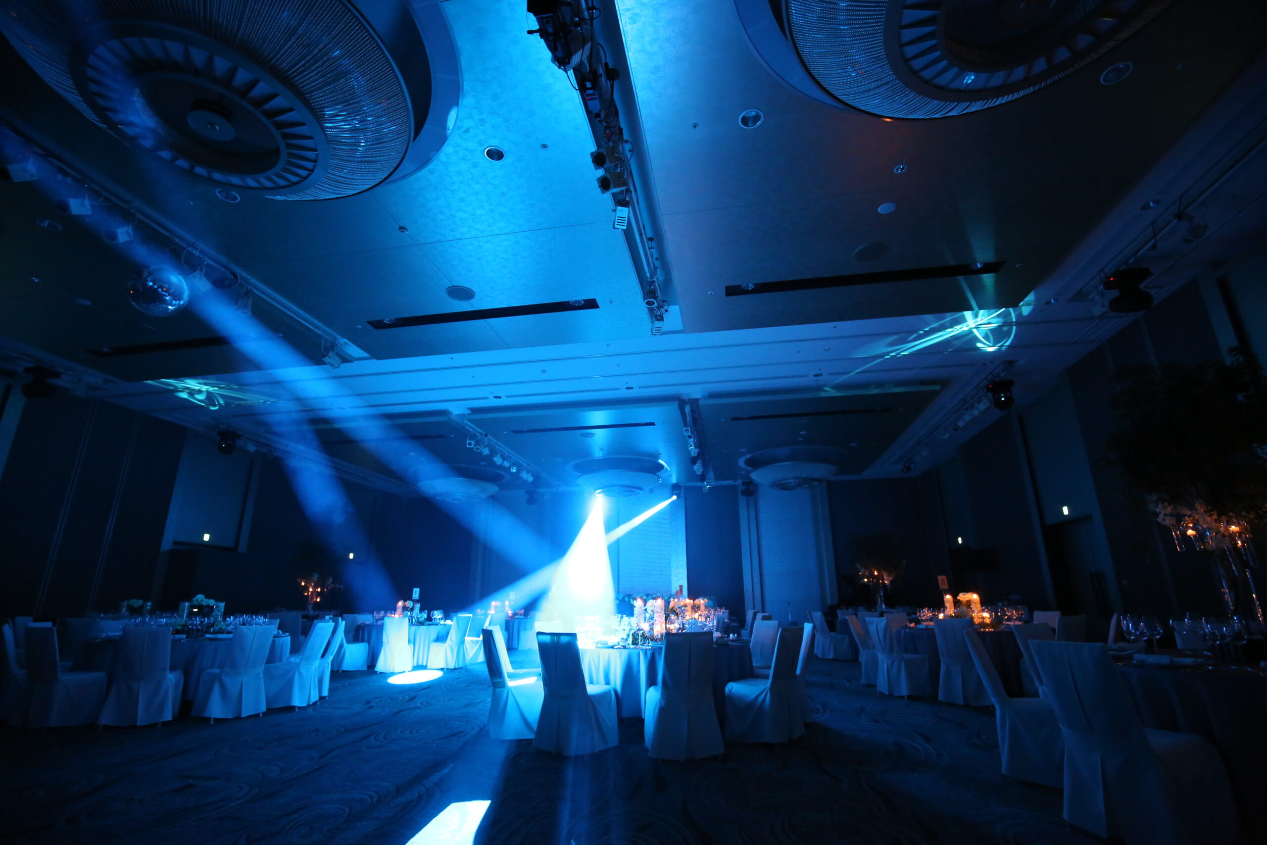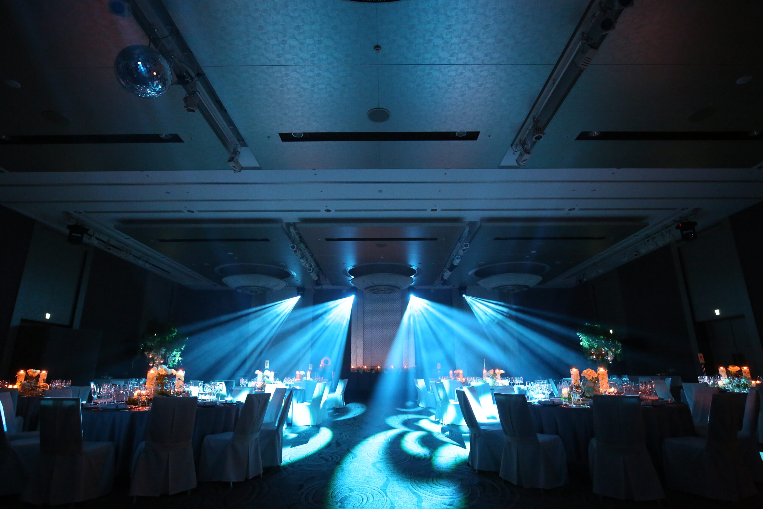 披露宴会場をフォトジェニックに彩るための特別な照明と音響機材を取り入れた総合演出です