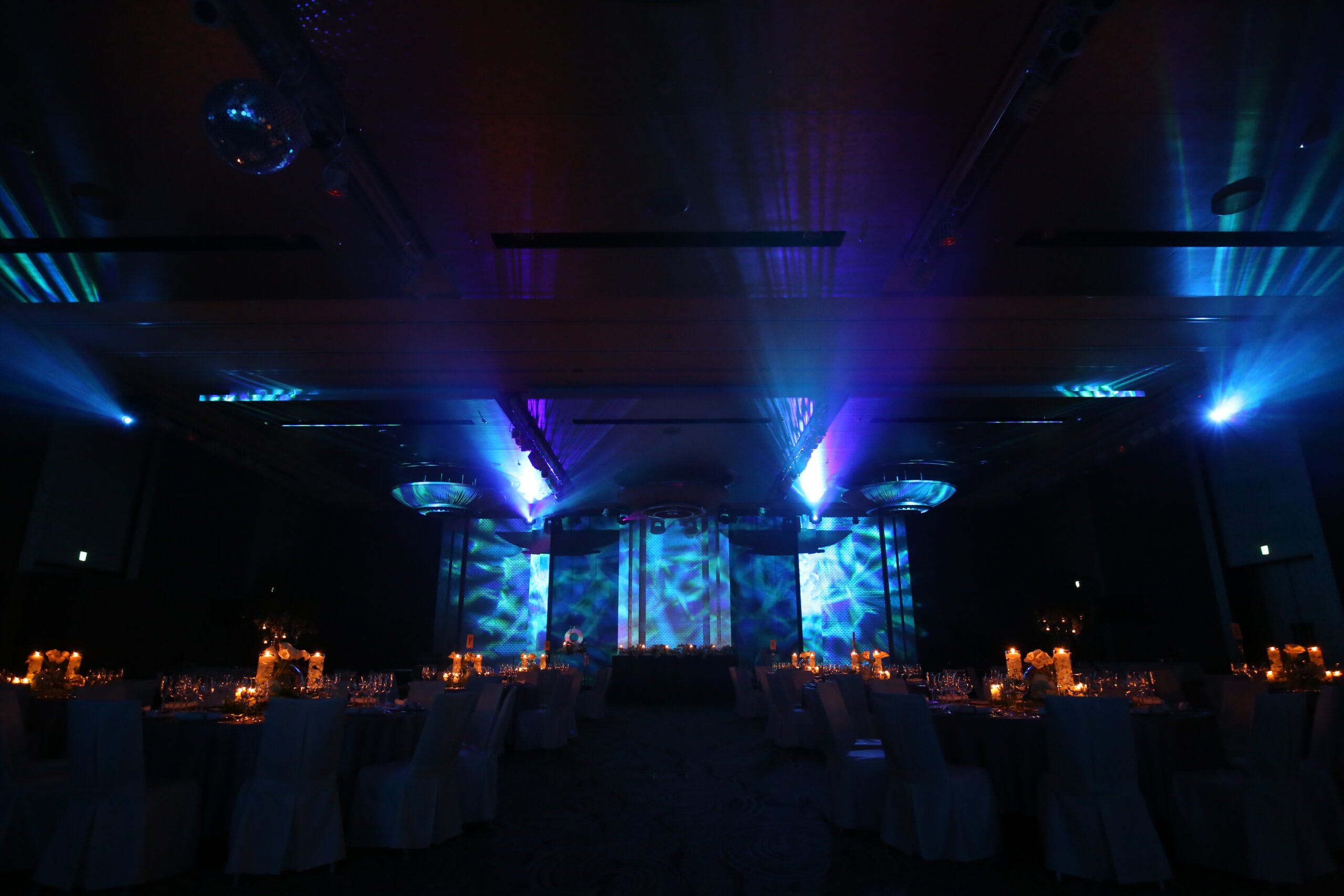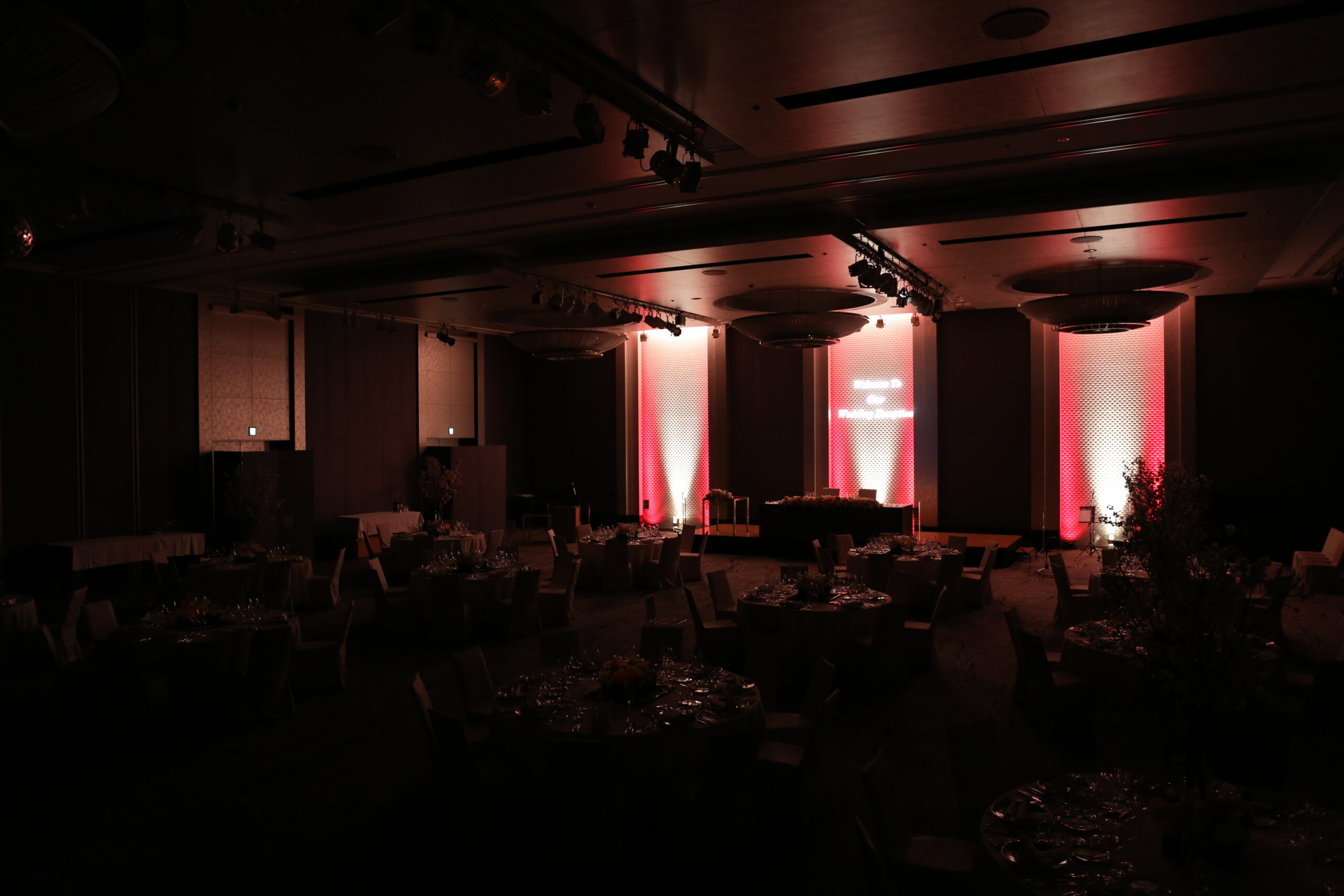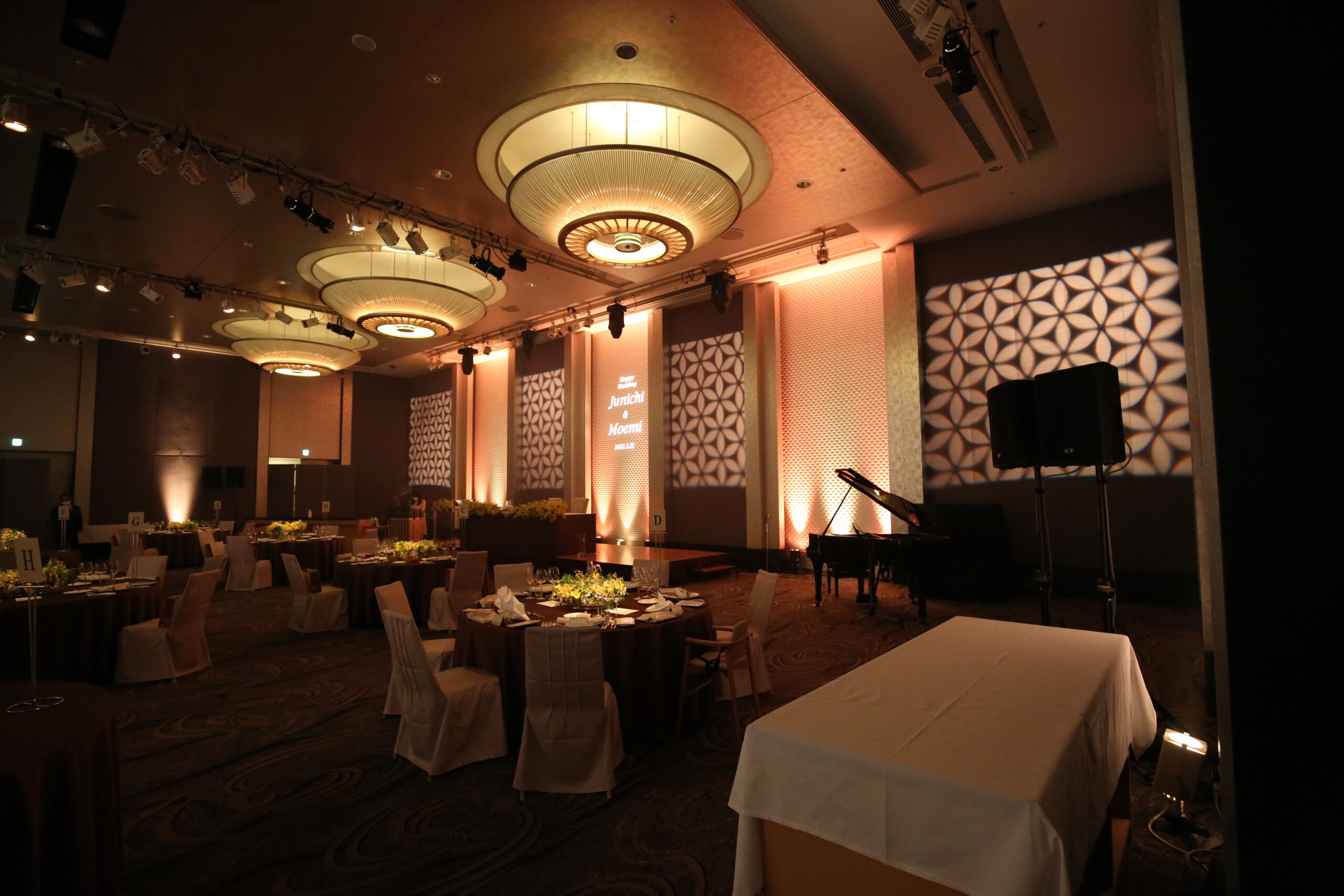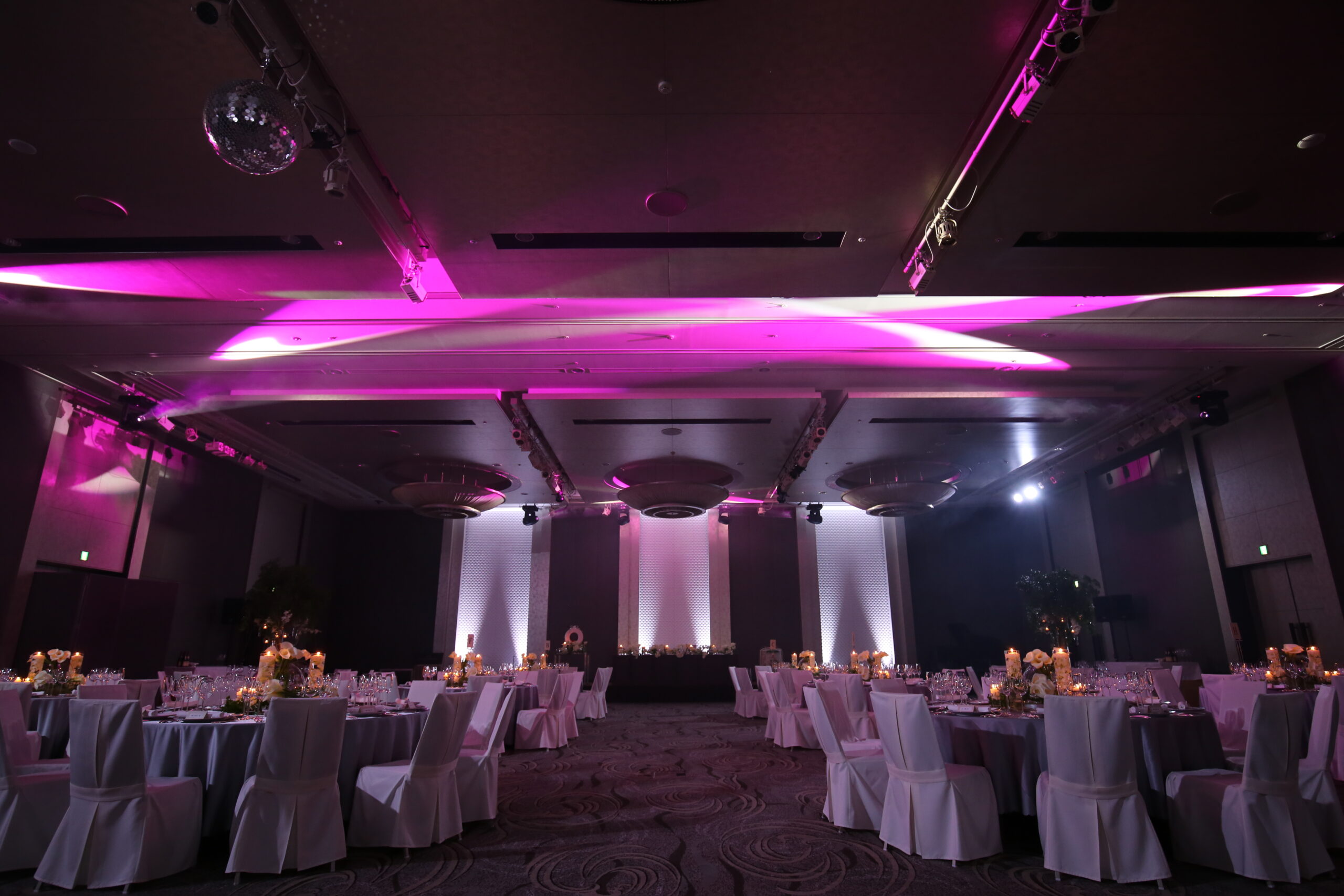披露宴会場をフォトジェニックに彩るための特別な照明と音響機材を取り入れた総合演出です
