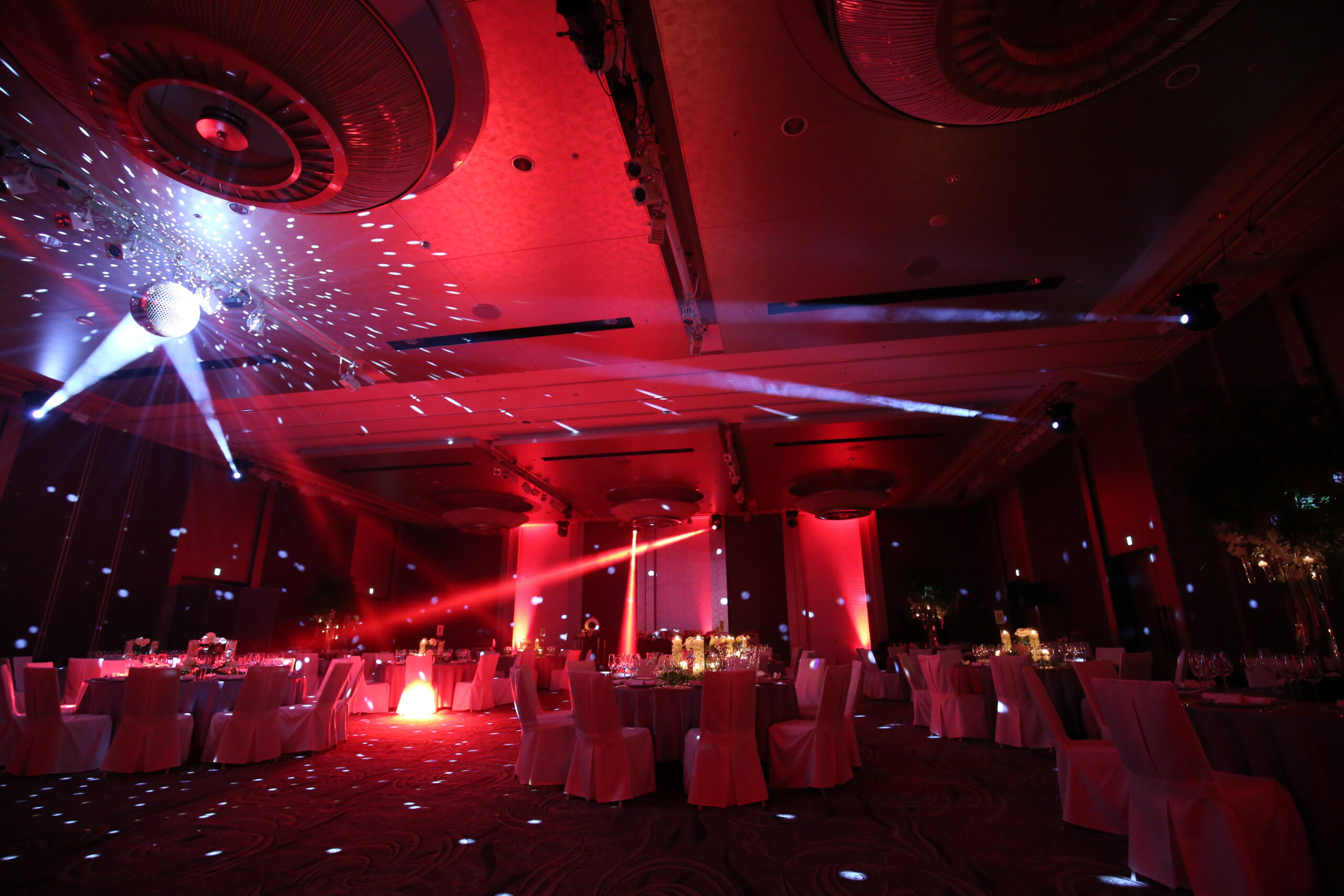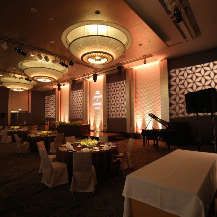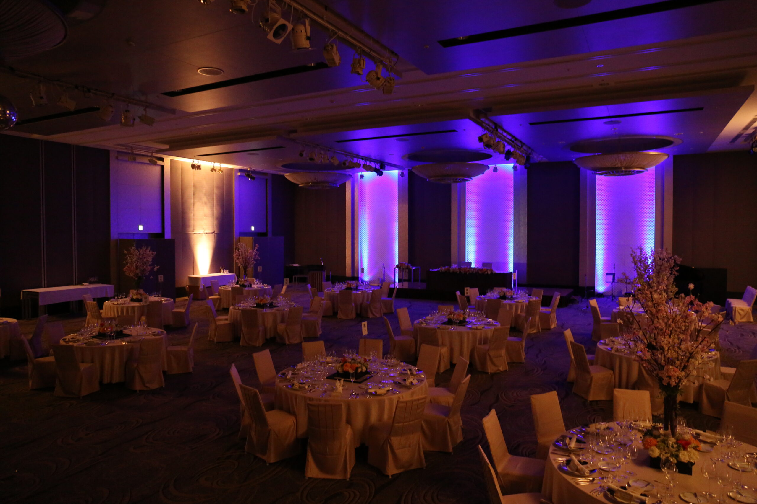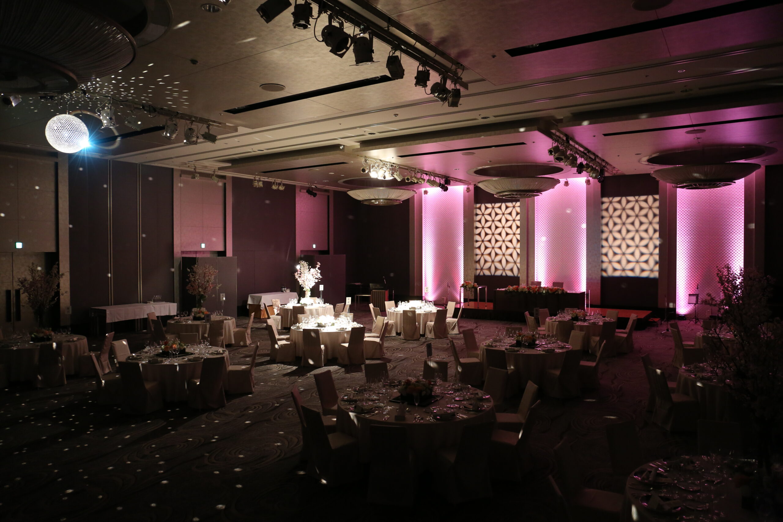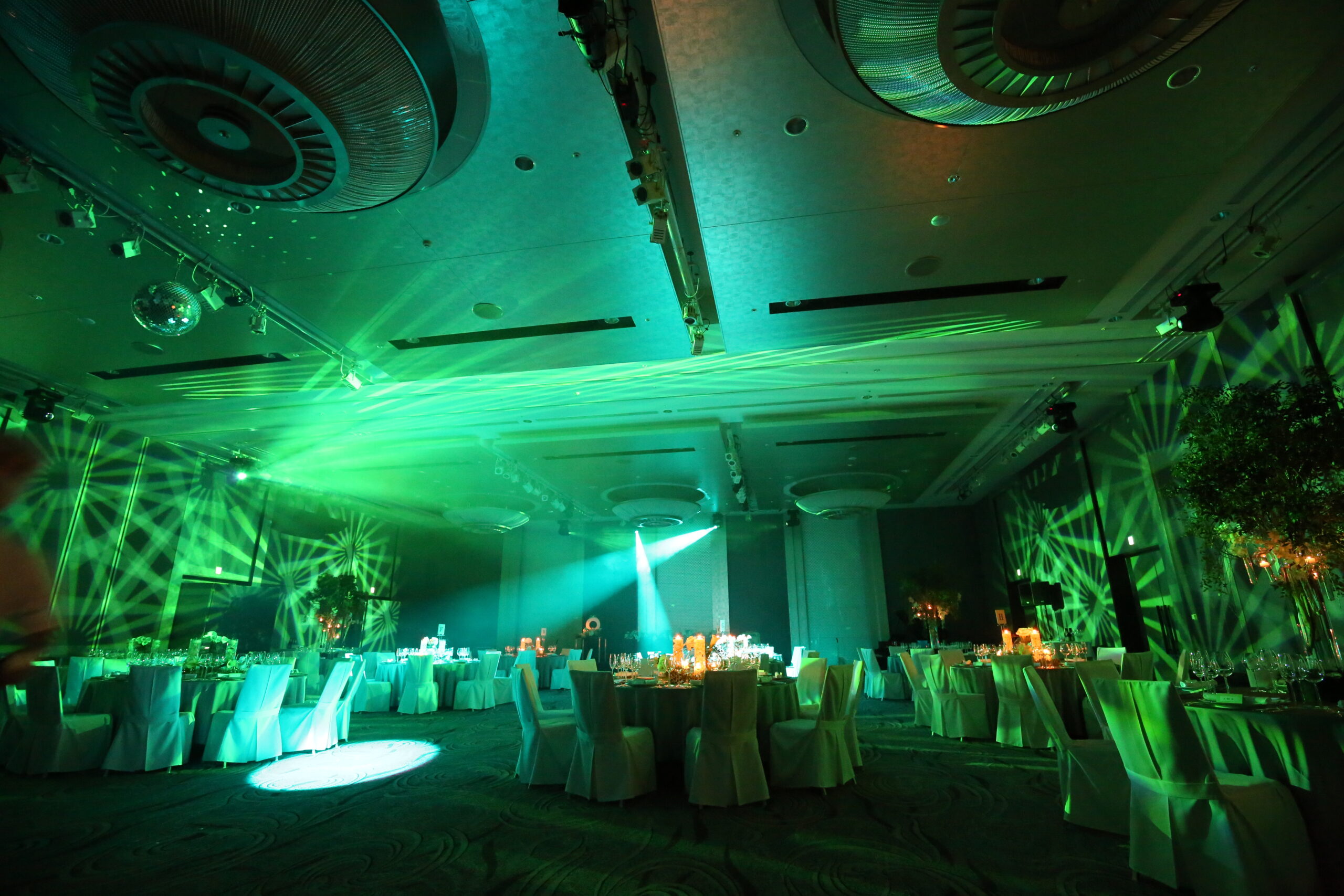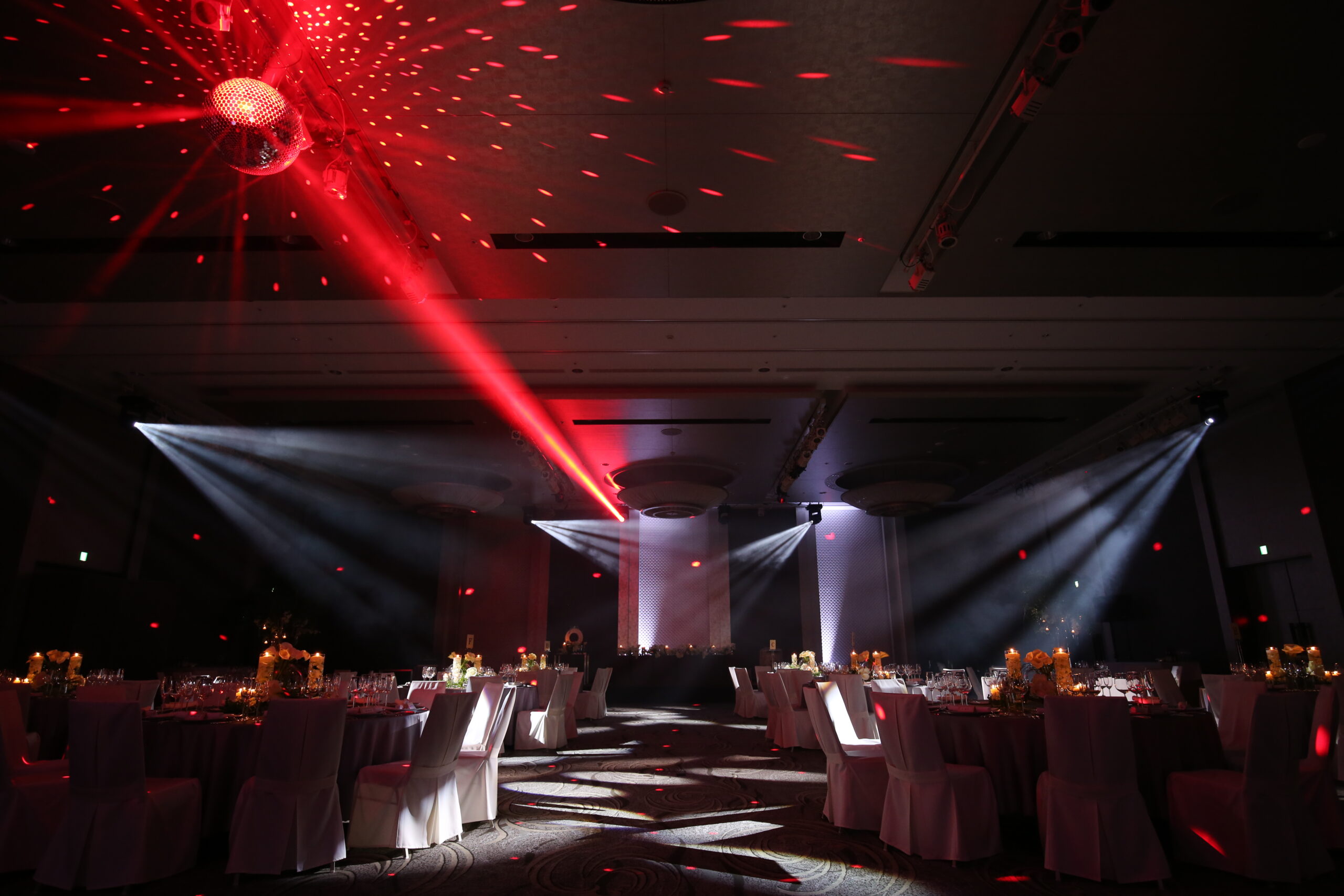 披露宴会場をフォトジェニックに彩るための特別な照明と音響機材を取り入れた総合演出です
