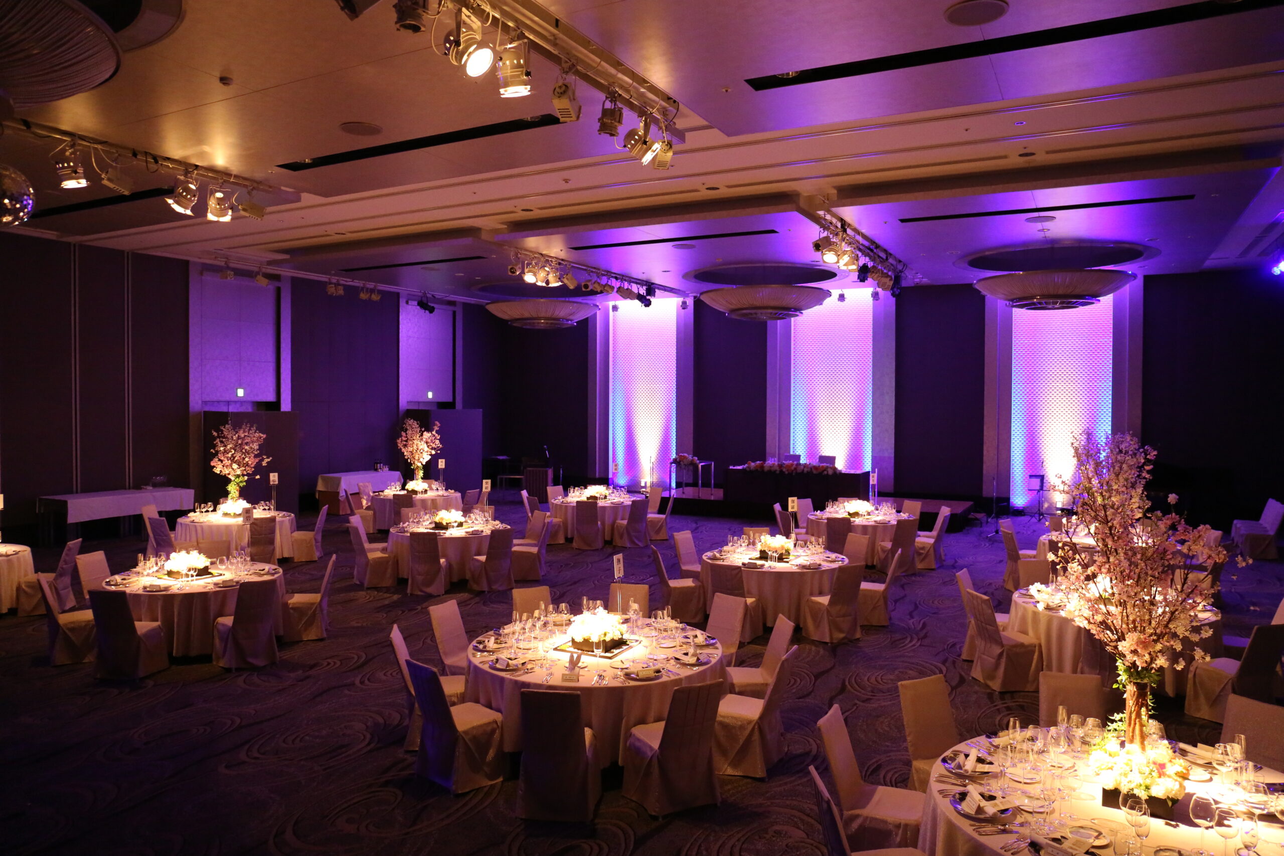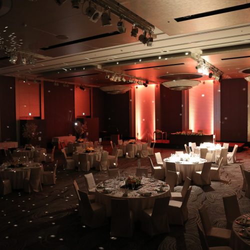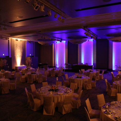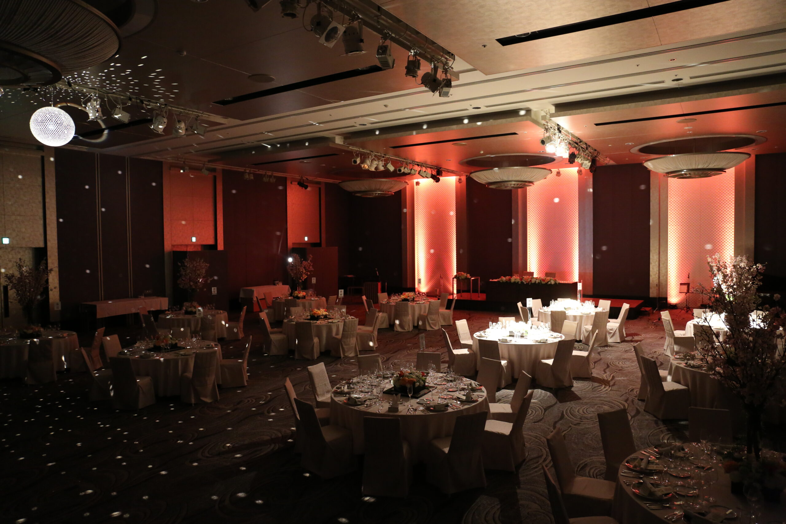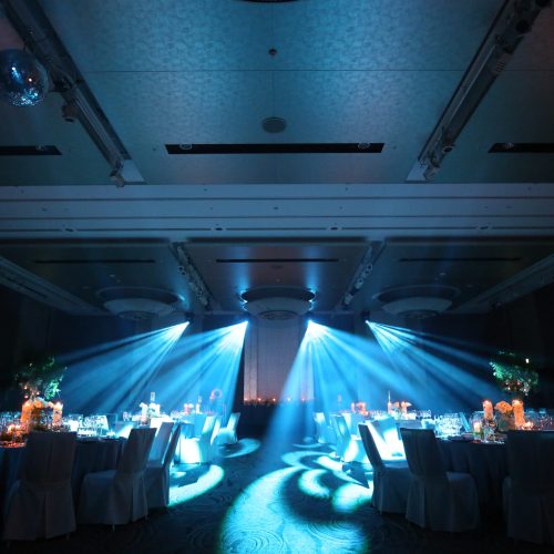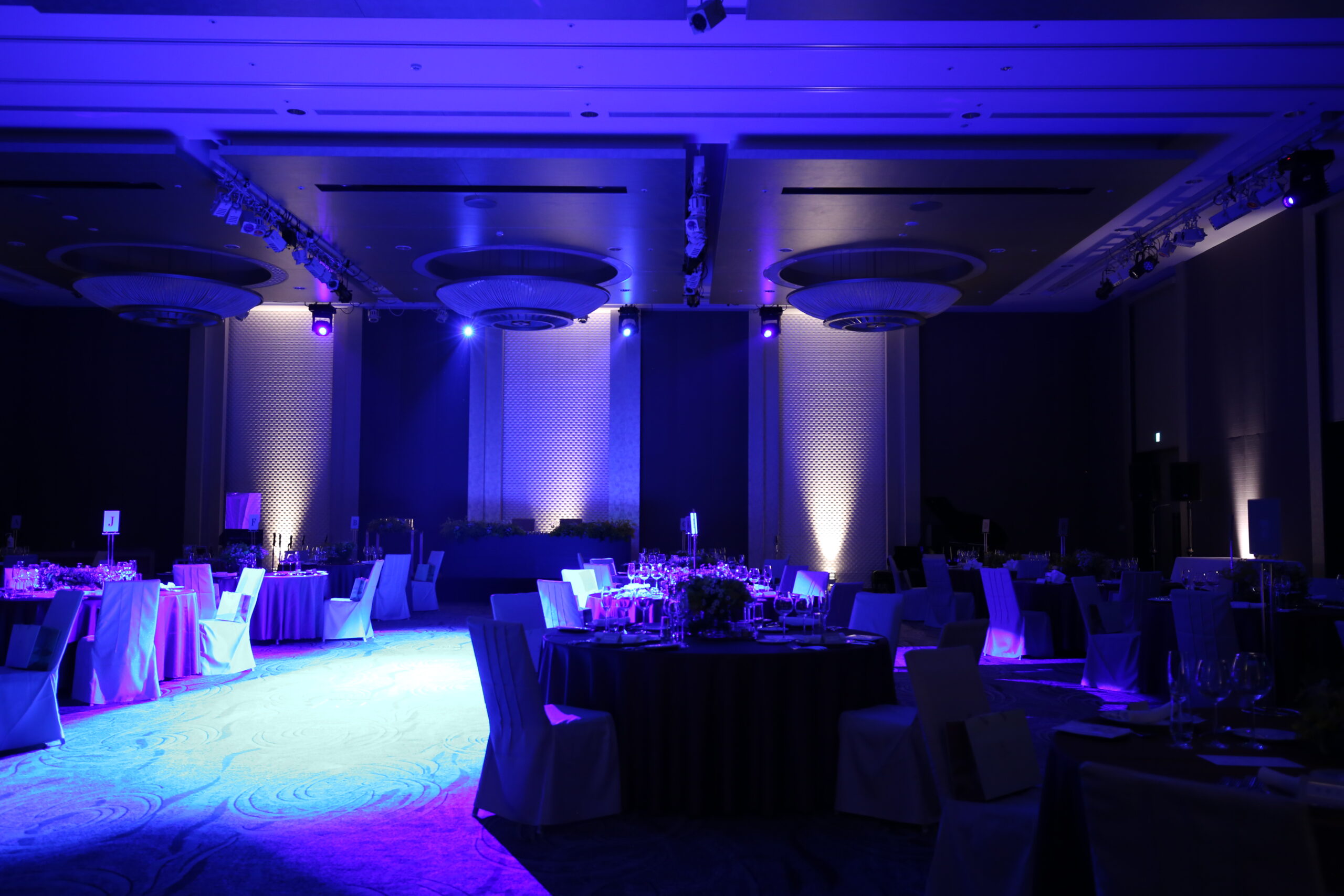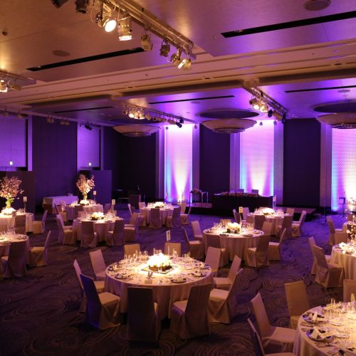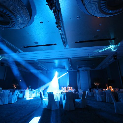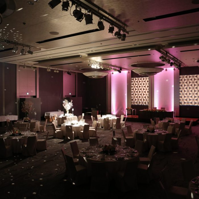 披露宴会場をフォトジェニックに彩るための特別な照明と音響機材を取り入れた総合演出です