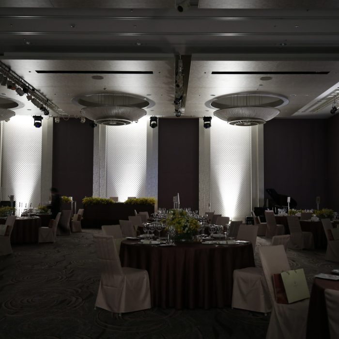 会場内を光の柱でライトアップして華やかな空間を演出します
