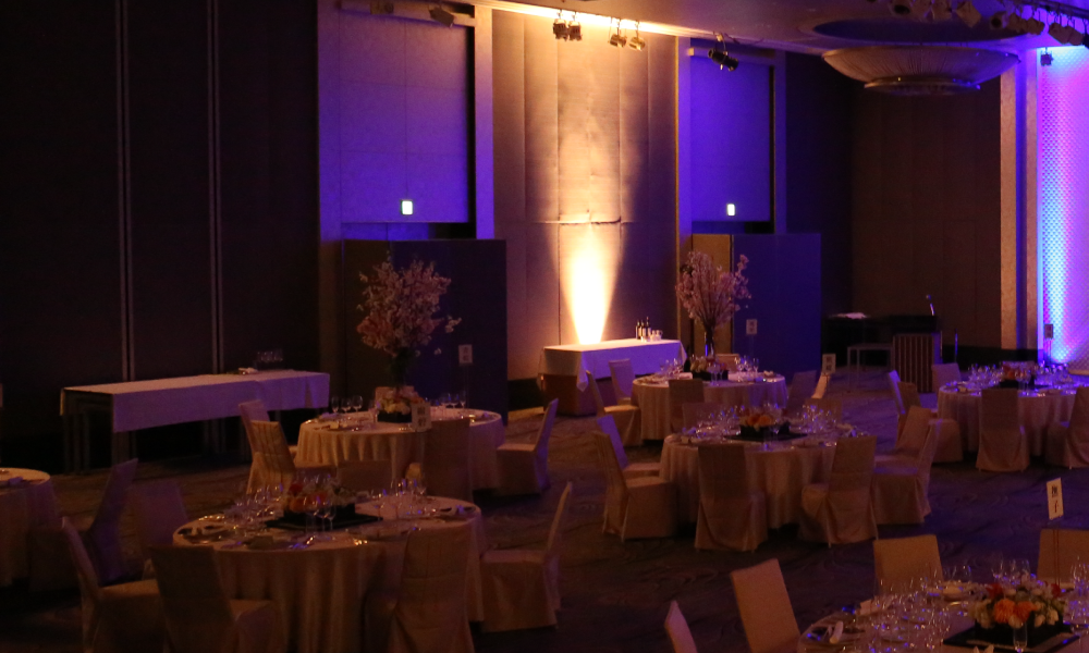 会場の壁面4カ所を光の柱でライトアップいたします。