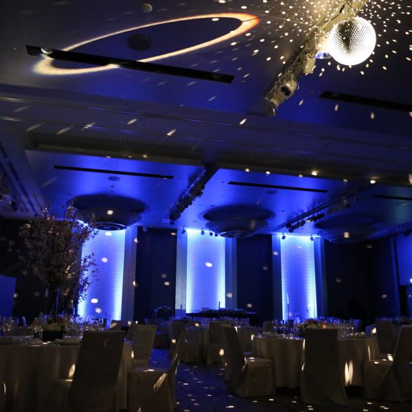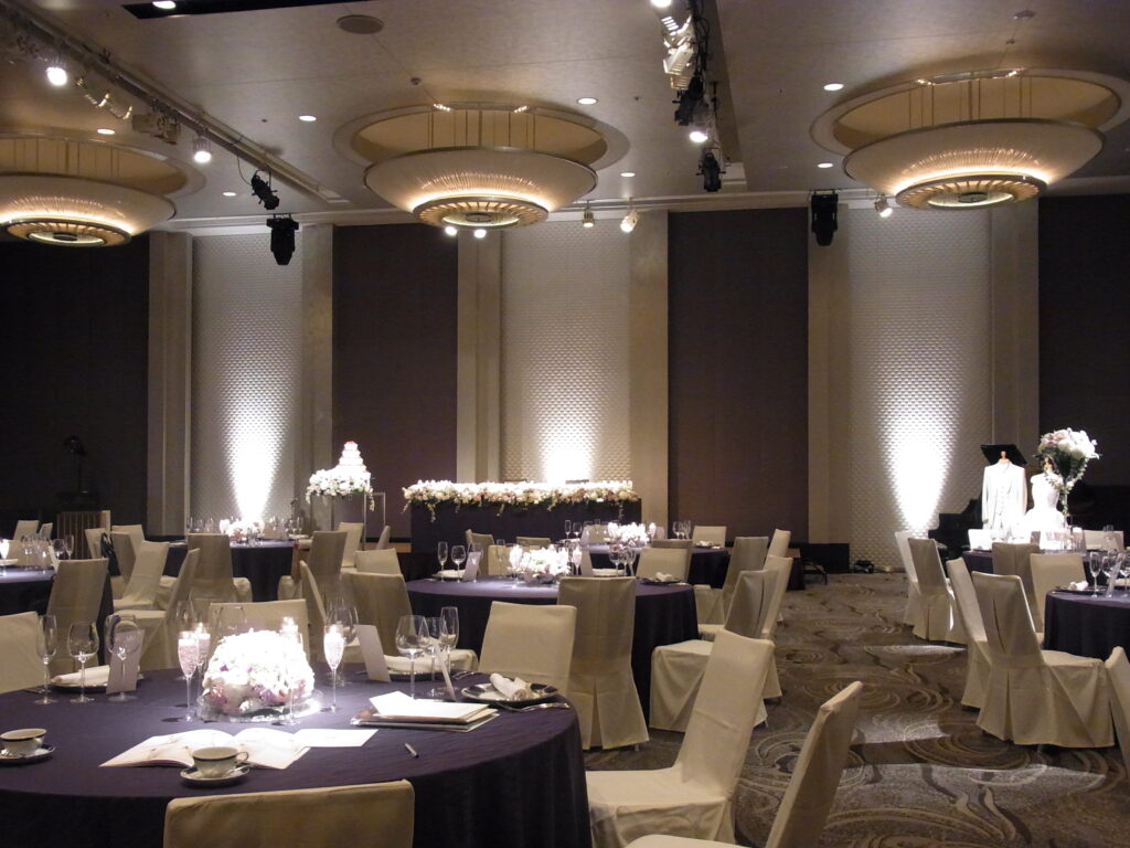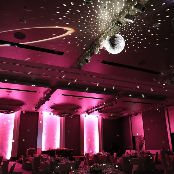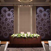 おふたりが座るメインテーブル後方を光の柱でライトアップいたします。