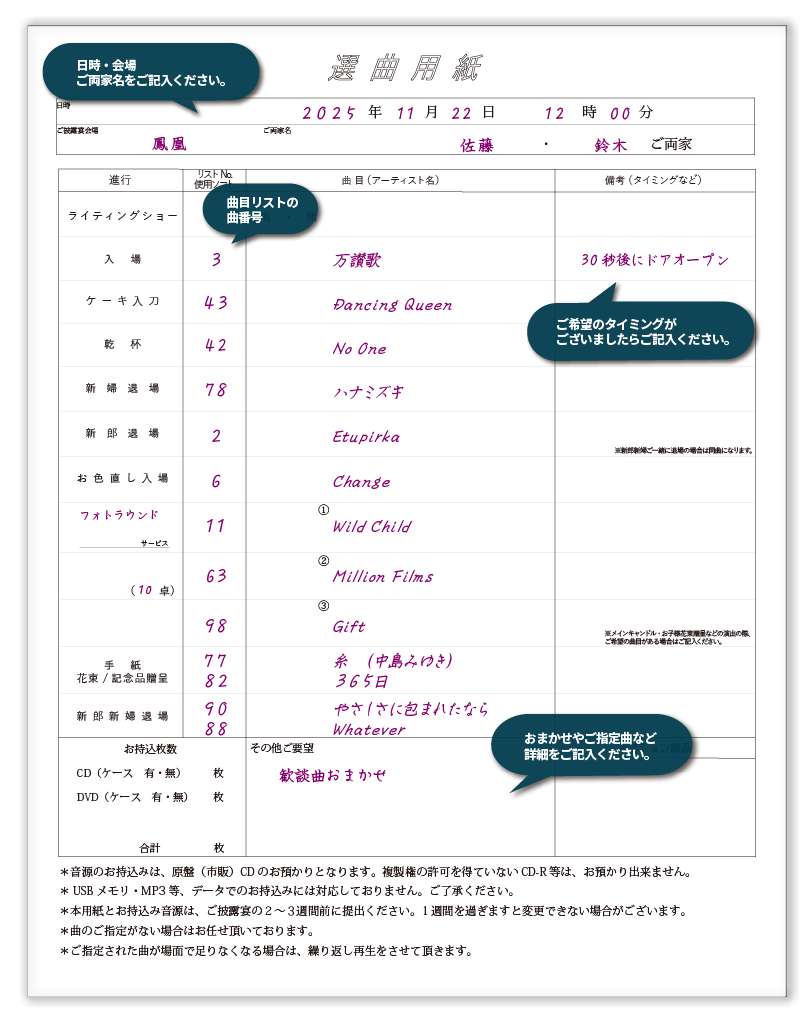 「選曲用紙」は下記の記入例を参考にご記入ください。