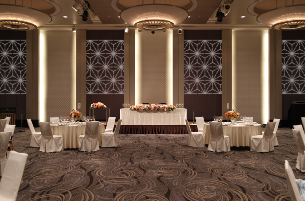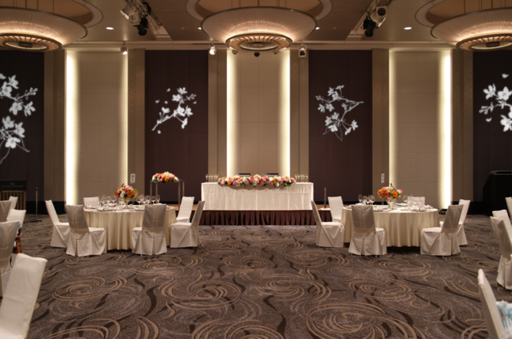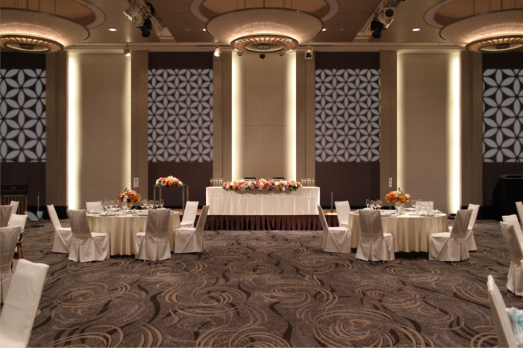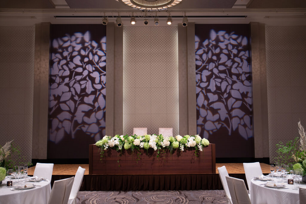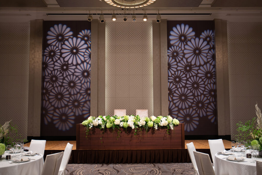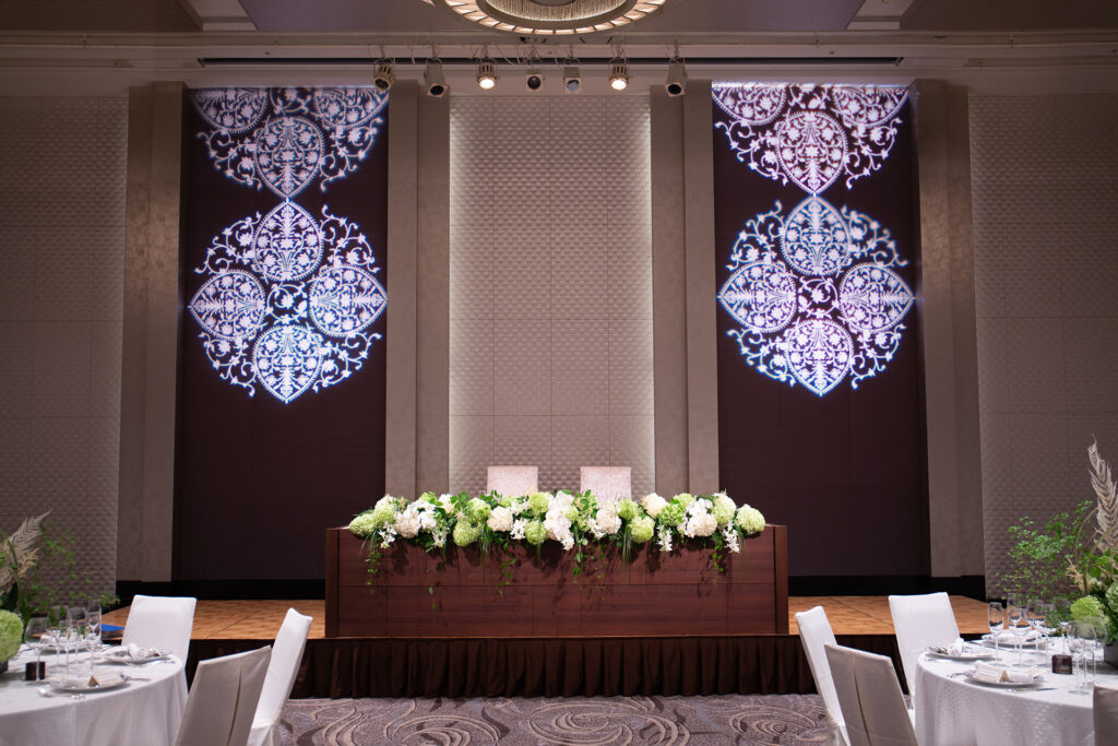 光で描く花柄や、格式ある和柄などの模様を加えることで、より一層会場を引き立たせます。メインテーブル後方の壁面2か所を演出いたします。